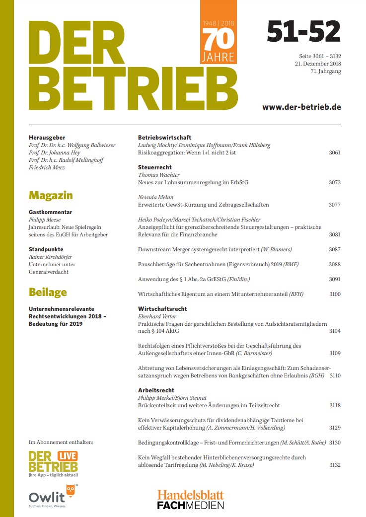 DER BETRIEB - Zeitschrift für Betriebswirtschaft, Steuerrecht, Wirtschaftsrecht, Arbeitsrecht